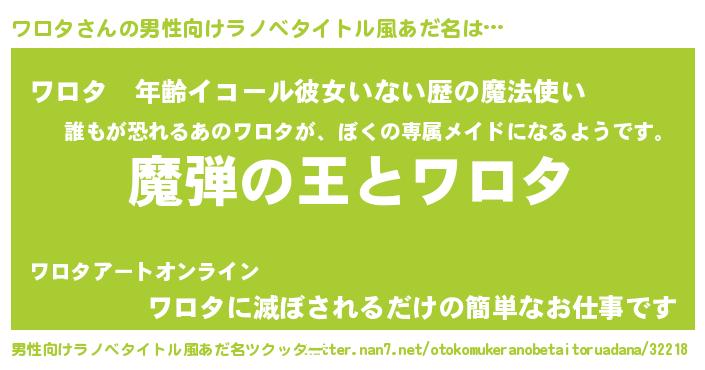 | 女子向けラノベタイトル風あだ名 | 『ワロタが死なない童話 林檎のワロタの診療簿』 |
