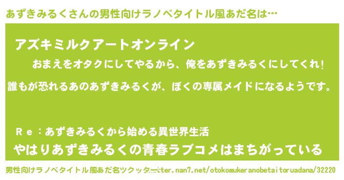 | 女子向けラノベタイトル風あだ名 | 『異世界でカフェあずきみるくを開店しました。』 |
