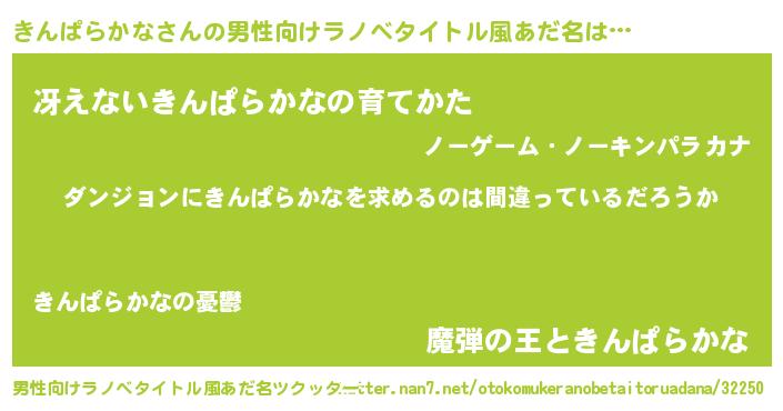 | 胡散臭い通販商品みたいなあだ名 | 『信頼と実績のサプリメント…その名も「きんぱらかな」』 |