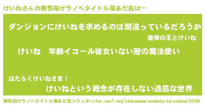 | 女子向けラノベタイトル風あだ名 | 『けいねの玉の輿計画!』 |