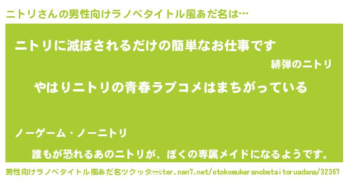 | 女子向けラノベタイトル風あだ名 | 『ニトリの雑貨屋さん』『ニトリ恋絵巻』 |