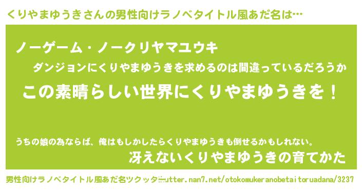 | 女子向けラノベタイトル風あだ名 | 『乙女ゲームの破滅フラグしかない悪役くりやまゆうきに転生してしまった…』 |
