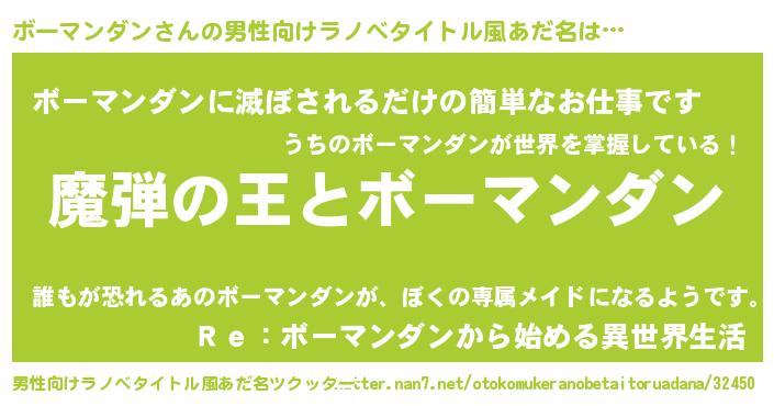 | 女子向けラノベタイトル風あだ名 | 『乙女ゲームの破滅フラグしかない悪役ボーマンダンに転生してしまった…』 |