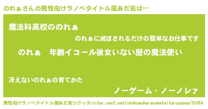 | 女子向けラノベタイトル風あだ名 | 『のれぁの玉の輿計画!』 |
