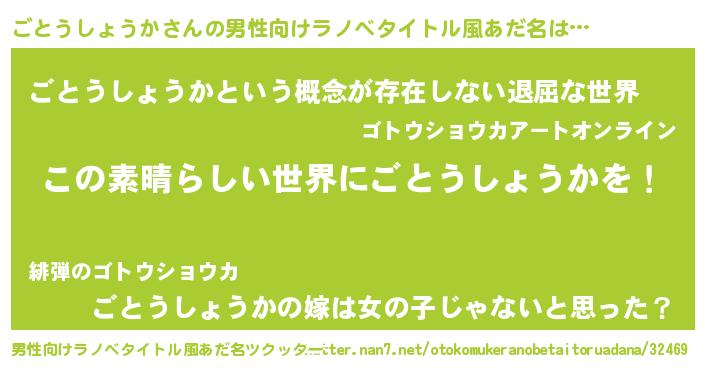 | 胡散臭い通販商品みたいなあだ名 | 『あなたにだけ特別に提供する100年もののヴィンテージワイン…その名も「ごとうしょうか」』 |
