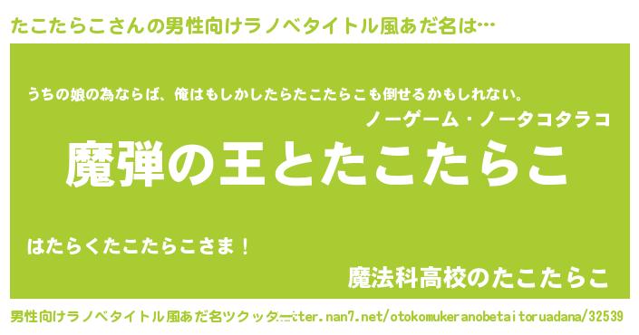 | 女子向けラノベタイトル風あだ名 | 『たこたらこが死なない童話 林檎のたこたらこの診療簿』 |