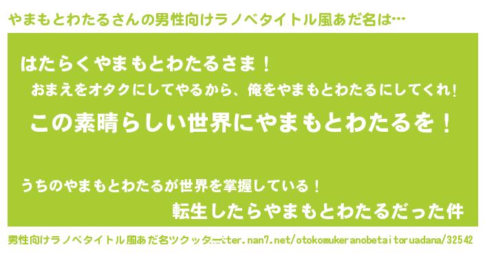 | 女子向けラノベタイトル風あだ名 | 『悪役やまもとわたるに転生したようですが、知った事ではありません』 |