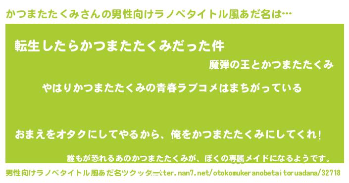 | 胡散臭い通販商品みたいなあだ名 | 『世界が平和になる高級そうな壺…その名も「かつまたたくみ」』 |