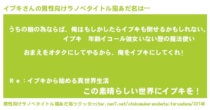 | 女子向けラノベタイトル風あだ名 | 『イブキ恋絵巻』『イブキの婚約者』 |