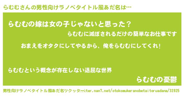 | 女子向けラノベタイトル風あだ名 | 『らむむ夫妻のなれそめ』 |