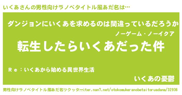 | 女子向けラノベタイトル風あだ名 | 『いくあの玉の輿計画!』『いくあ恋絵巻』 |