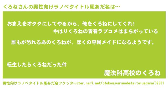 | ヘコむあだ名 | 『くろね(苦笑)』『豆乳』『くろお』 |