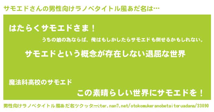 | 女子向けラノベタイトル風あだ名 | 『異世界で失敗しない100のサモエド』 |