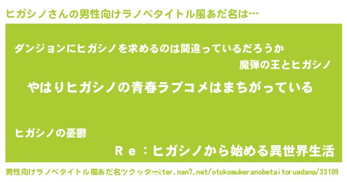 | ファンタジー風あだ名 | 『エターナルヒガシノー』『ゼヒガトゥ』 |