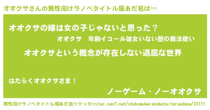 | 女子向けラノベタイトル風あだ名 | 『異世界で失敗しない100のオオクサ』 |