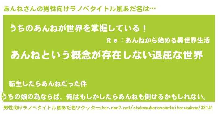 | 女子向けラノベタイトル風あだ名 | 『異世界で失敗しない100のあんね』 |