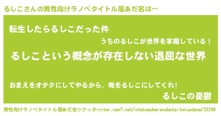 | 女子向けラノベタイトル風あだ名 | 『異世界で失敗しない100のるしこ』 |