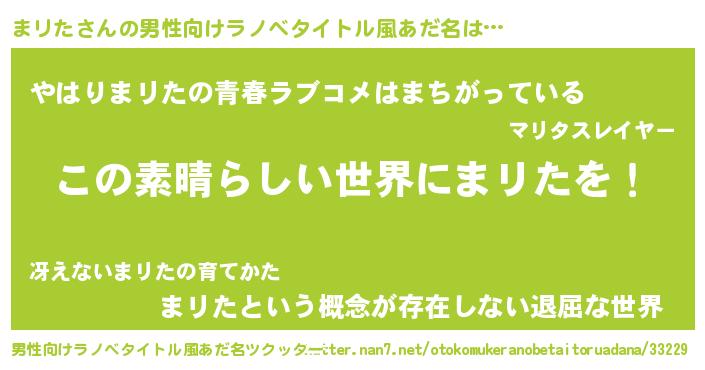 | 女子向けラノベタイトル風あだ名 | 『乙女ゲームの破滅フラグしかない悪役まリたに転生してしまった…』 |