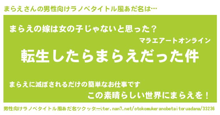 | 女子向けラノベタイトル風あだ名 | 『まらえの玉の輿計画!』 |