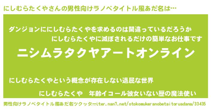 | 女子向けラノベタイトル風あだ名 | 『誰かこのにしむらたくやを説明してください! ~契約から始まるウェディング~』 |