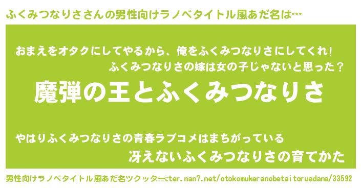 | 女子向けラノベタイトル風あだ名 | 『ふくみつなりさが死なない童話 林檎のふくみつなりさの診療簿』 |