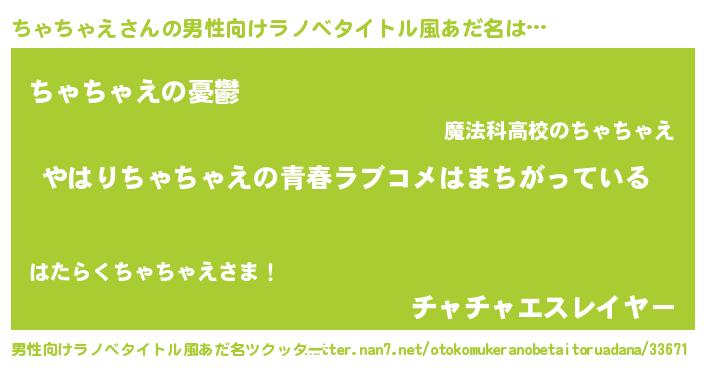| 女子向けラノベタイトル風あだ名 | 『ちゃちゃえ伯爵の花嫁』 |