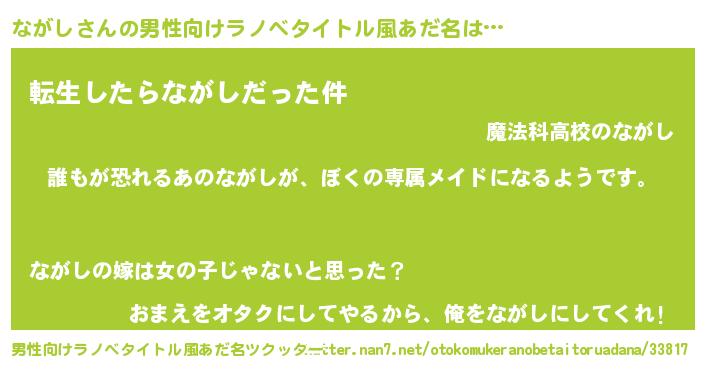 | 女子向けラノベタイトル風あだ名 | 『異世界でカフェながしを開店しました。』 |