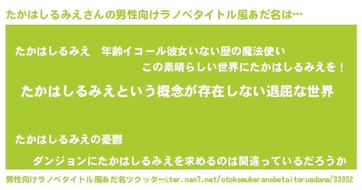 | 女子向けラノベタイトル風あだ名 | 『異世界で失敗しない100のたかはしるみえ』 |