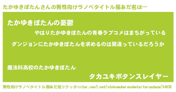 | 女子向けラノベタイトル風あだ名 | 『たかゆきぼたんの卵を拾いまして』 |