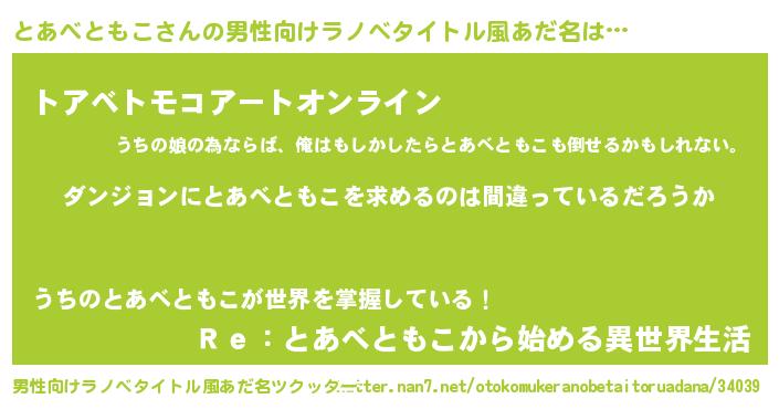 | 女子向けラノベタイトル風あだ名 | 『とあべともこの卵を拾いまして』 |
