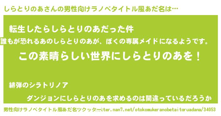 | 意味不明あだ名 | 『住所不定無職しらとりのあ(95歳)』 |