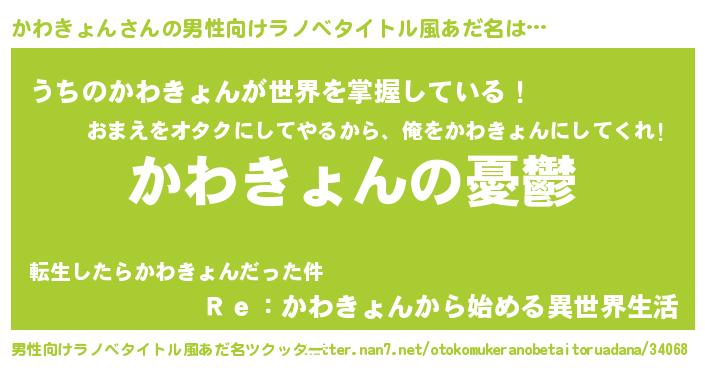 | 女子向けラノベタイトル風あだ名 | 『(仮)かわきょんのやんごとなき事情』 |