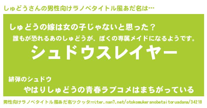 | 胡散臭い通販商品みたいなあだ名 | 『信頼と実績のサプリメント…その名も「しゅどう」』 |
