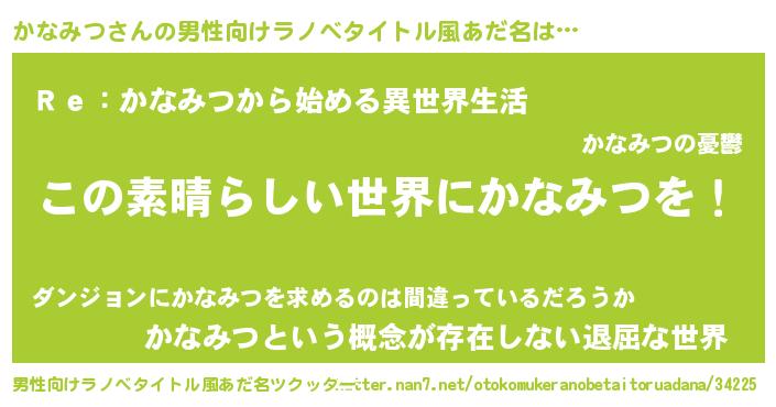 | 女子向けラノベタイトル風あだ名 | 『乙女ゲームの破滅フラグしかない悪役かなみつに転生してしまった…』 |