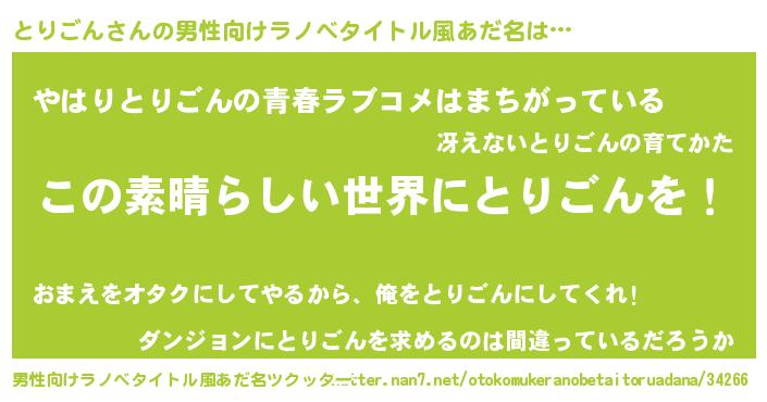 | 胡散臭い通販商品みたいなあだ名 | 『あなたにだけ特別に提供する限定10本のレアな日本酒…その名も「とりごん」』 |