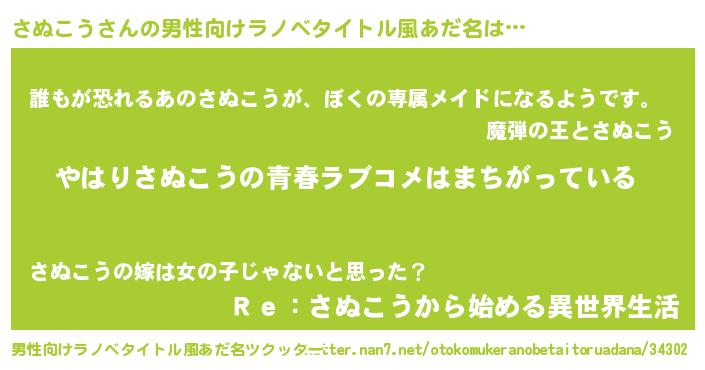 | 女子向けラノベタイトル風あだ名 | 『さぬこうの雑貨屋さん』 |