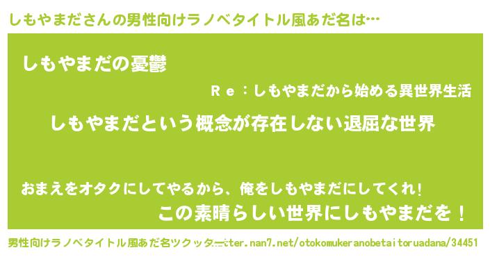 | 胡散臭い通販商品みたいなあだ名 | 『絶対に幸福をもたらす健康食品…その名も「しもやまだ」』 |