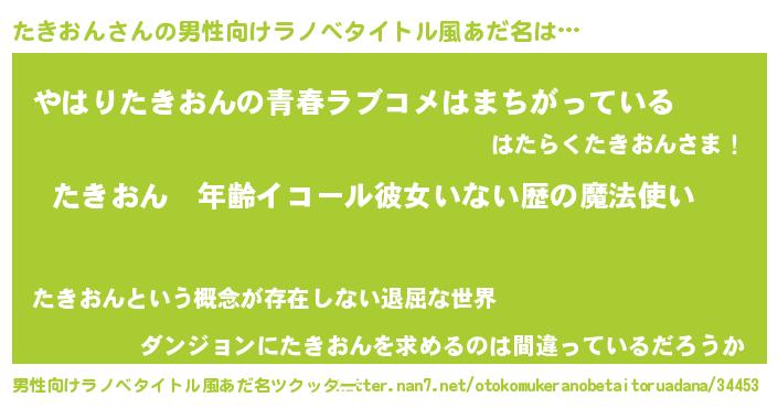 | 女子向けラノベタイトル風あだ名 | 『たきおんの玉の輿計画!』 |