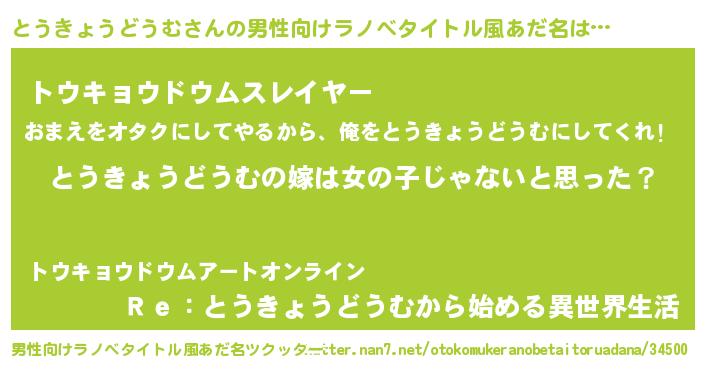 | 女子向けラノベタイトル風あだ名 | 『とうきょうどうむの卵を拾いまして』 |