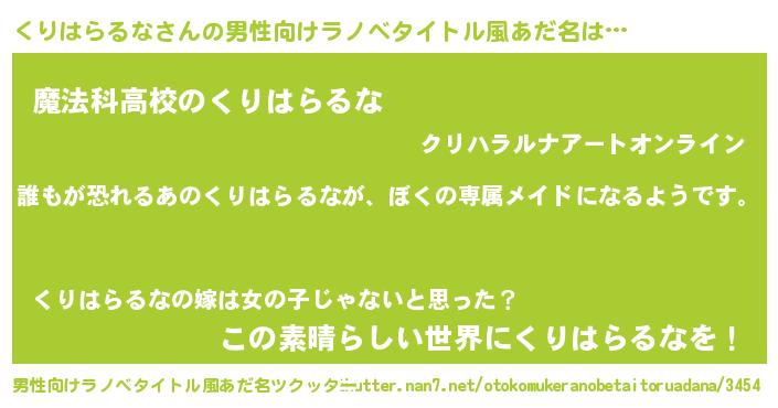 | 女子向けラノベタイトル風あだ名 | 『異世界でカフェくりはらるなを開店しました。』 |