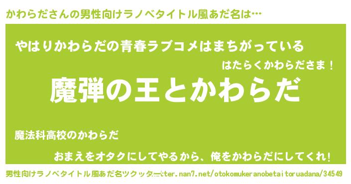 | 女子向けラノベタイトル風あだ名 | 『かわらだが死なない童話 林檎のかわらだの診療簿』 |