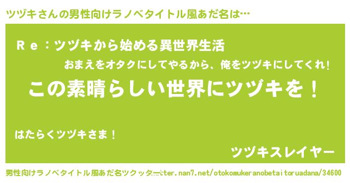 | 女子向けラノベタイトル風あだ名 | 『悪役ツヅキに転生したようですが、知った事ではありません』 |