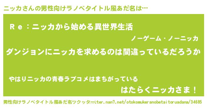 | 女子向けラノベタイトル風あだ名 | 『ニッカの卵を拾いまして』 |