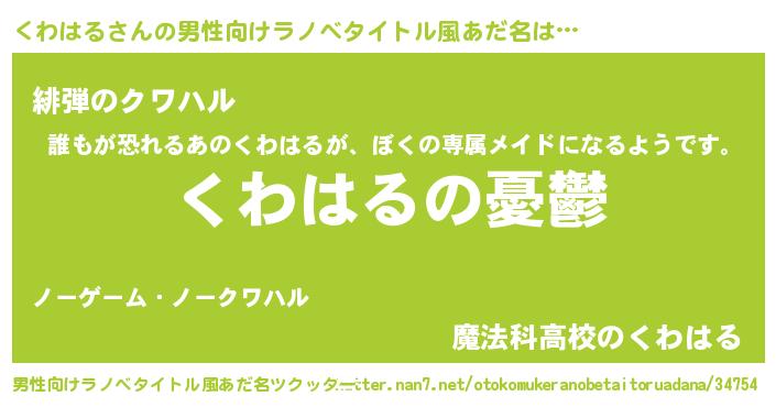 | 女子向けラノベタイトル風あだ名 | 『(仮)くわはるのやんごとなき事情』 |