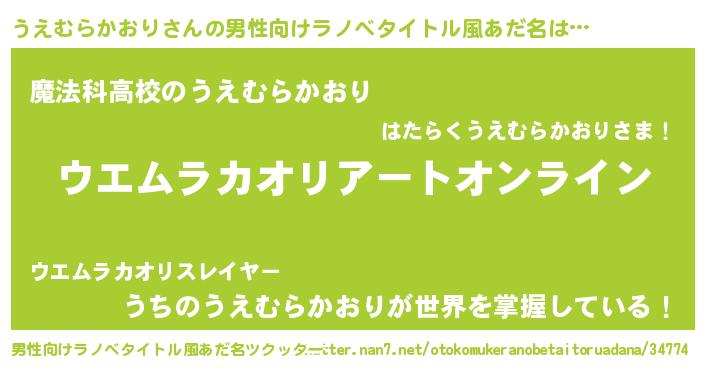 | 女子向けラノベタイトル風あだ名 | 『誰かこのうえむらかおりを説明してください! ~契約から始まるウェディング~』 |