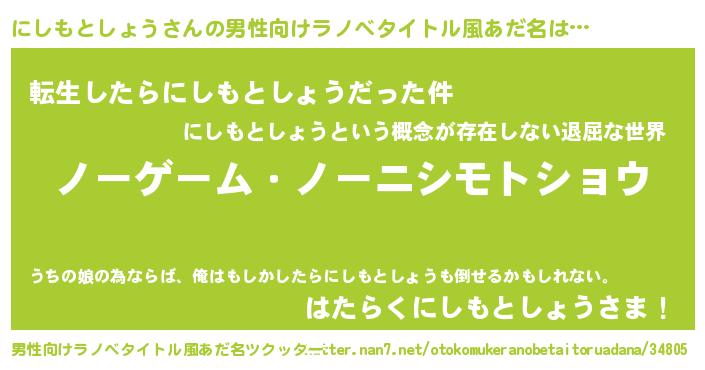 | ヘコむあだ名 | 『にしもとしょう(爆)』『豆乳』 |