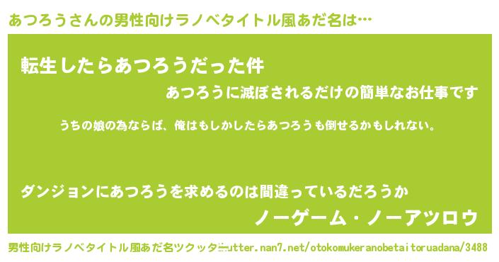 | 女子向けラノベタイトル風あだ名 | 『あつろう伯爵の花嫁』 |