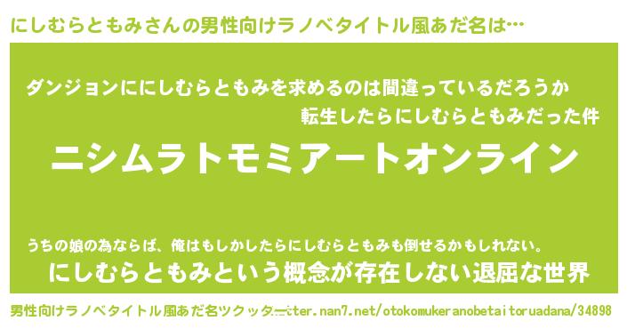 | 女子向けラノベタイトル風あだ名 | 『誰かこのにしむらともみを説明してください! ~契約から始まるウェディング~』 |