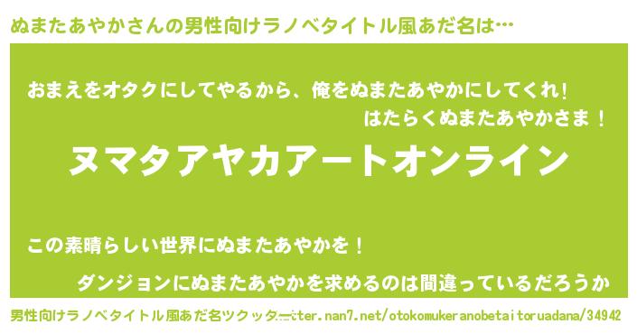 | 女子向けラノベタイトル風あだ名 | 『誰かこのぬまたあやかを説明してください! ~契約から始まるウェディング~』 |