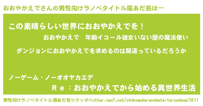 | 胡散臭い通販商品みたいなあだ名 | 『信頼と実績のサプリメント…その名も「おおやかえで」』 |